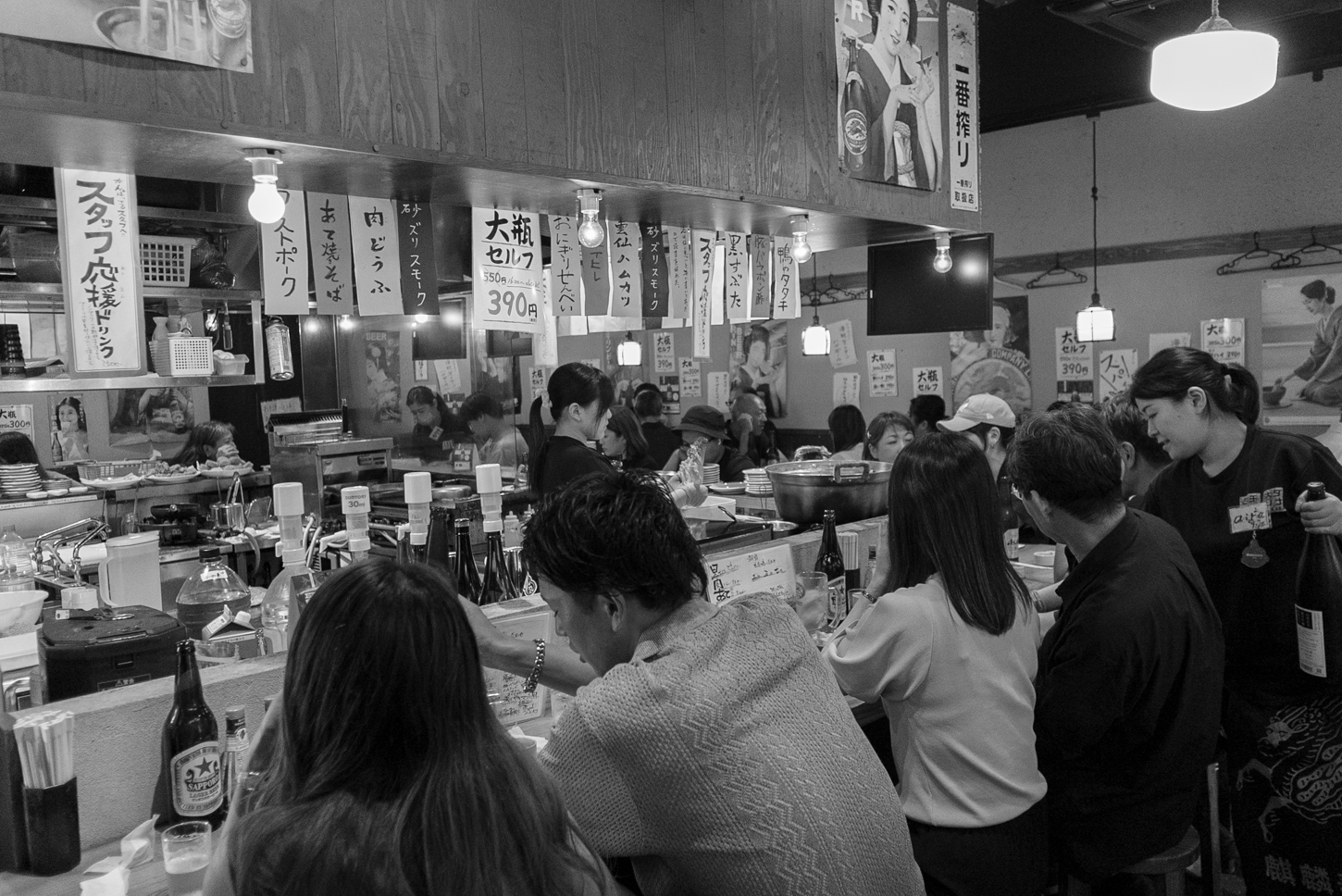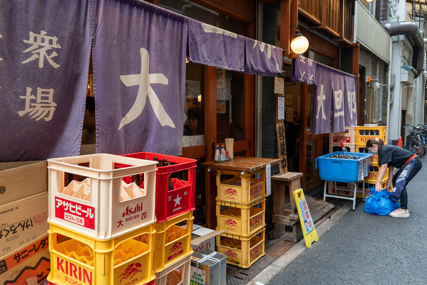 JR天満駅から徒歩3分。平日でも人通りの多い天神橋筋商店街を細い路地に切れ込んだところに目指す大旦那天満本店はある。間口いっぱいに暖簾がかけられビールケースが堆く積み上げられた風景は、まさに昭和の大衆酒場と言っていいだろう。この年季を感じさせる佇まいは昨日や今日の開店では無理だな、相当長く営っているに違いないと勝手に思い込んでいた。が、2017年の開店だというではないか。7年、8年でこの味のある空気が醸し出せるのだ。これは余程のプロの飲み手が足繁く通いこの店を育ててきたに違いないと思った。