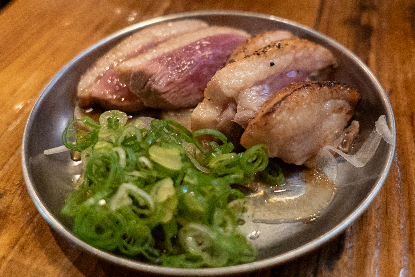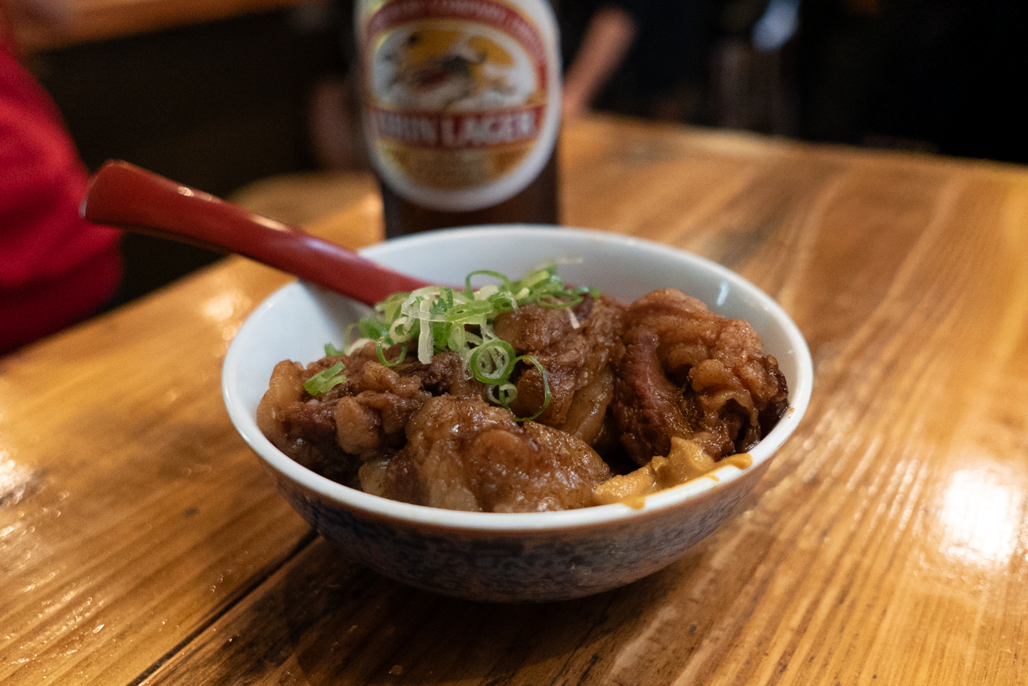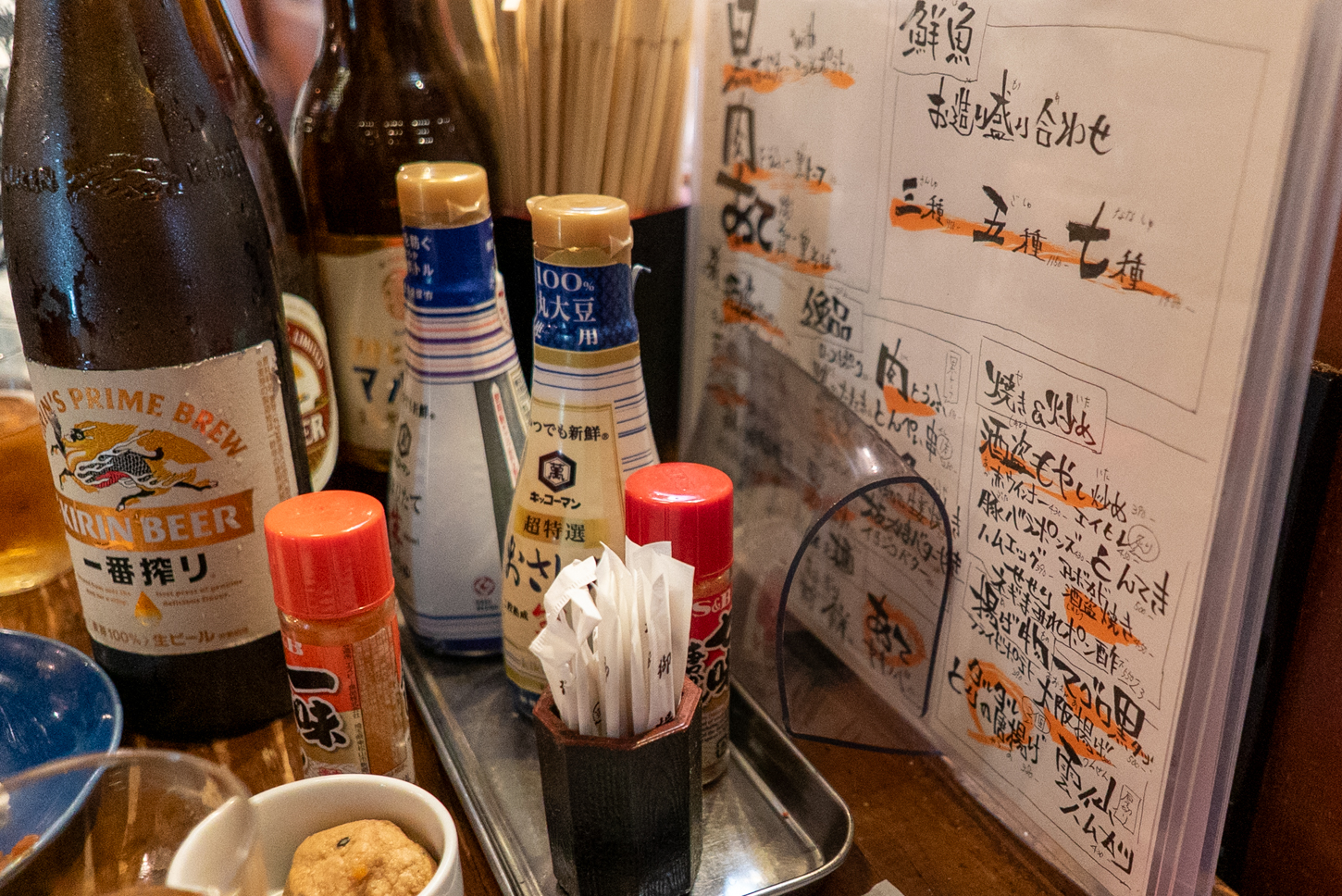 酒盗ポテサラ(430円)が目にとまった。これは単にポテサラに酒盗を乗せたり混ぜたりしたものではなかった。どういう工夫がされているのか酔った頭ではわからないが、間違いなく酒がすすむ。他にも冷奴酒盗(380円)、酒盗キャベツ(390円)と酒盗を使った肴がある。我々はさらにキリン一番搾りとカモのタタキ(590円)を追加した。こういう酒呑みを唸らせるような種類豊富な肴がプロの飲み手が集う昭和の酒場という雰囲気をより色濃く醸し出しているのかもしれない。