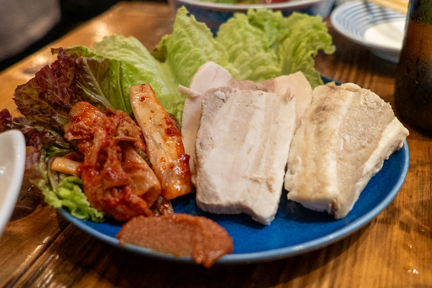 あまりビールを飲む方じゃないが、こう安くてはビールをということになる。肴もビールにあうものになる。とりあえずはここの名物ということで黒どーふ(肉どうふ670円)と蒸し豚キムチ(470円)を注文する。黒どーふは肉の量が半端ではなかった。それは蒸し豚も同じだ。最近はピンチョスなどというものが流行り、ひと口サイズじゃあないかという肴が出てくることも少なくない。だがここはそんな心配はないようだ。しかも味もなかなかだ。蒸し豚キムチは添えられたキムチ、辛味噌がいい。それだけでもビールがすすむ。