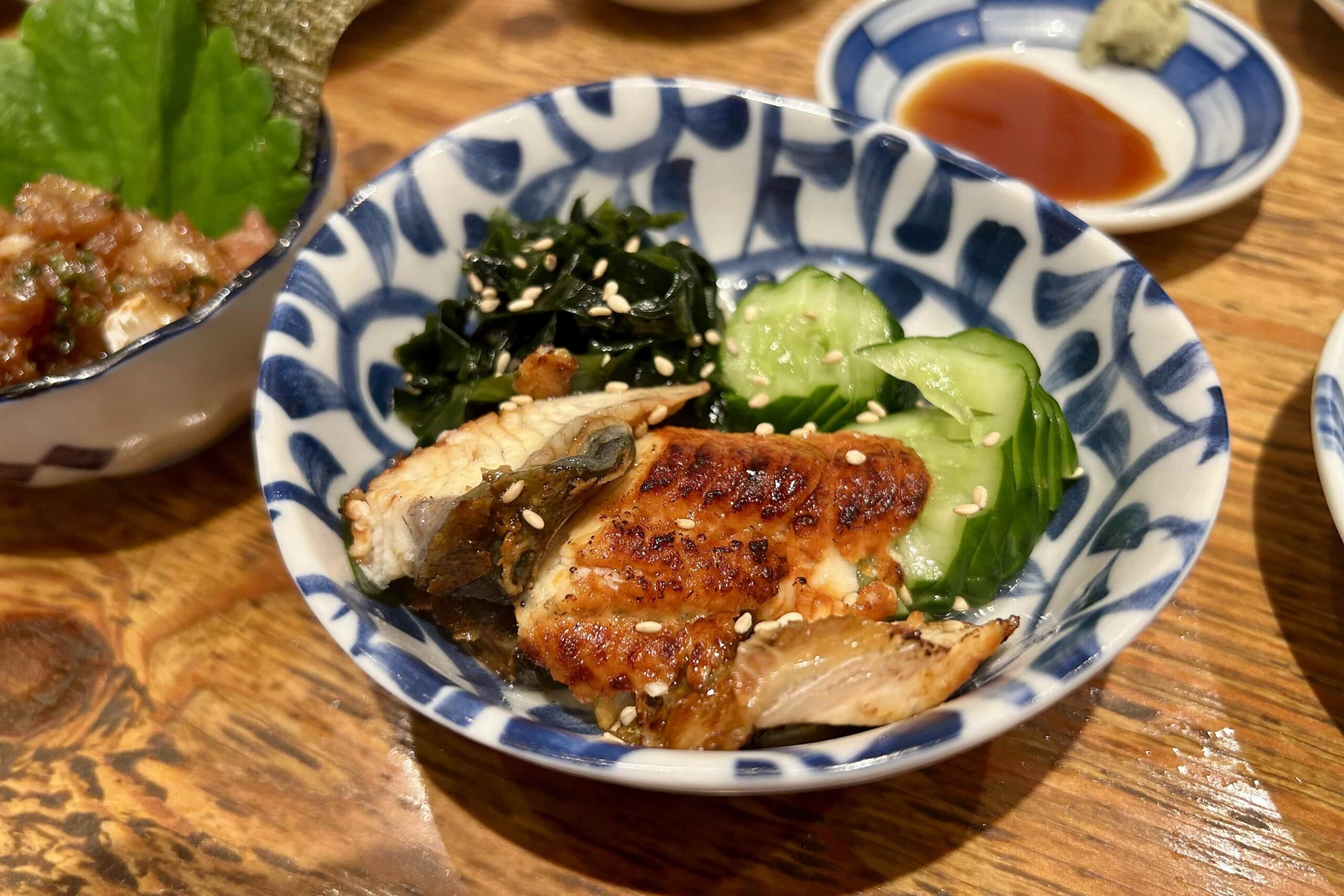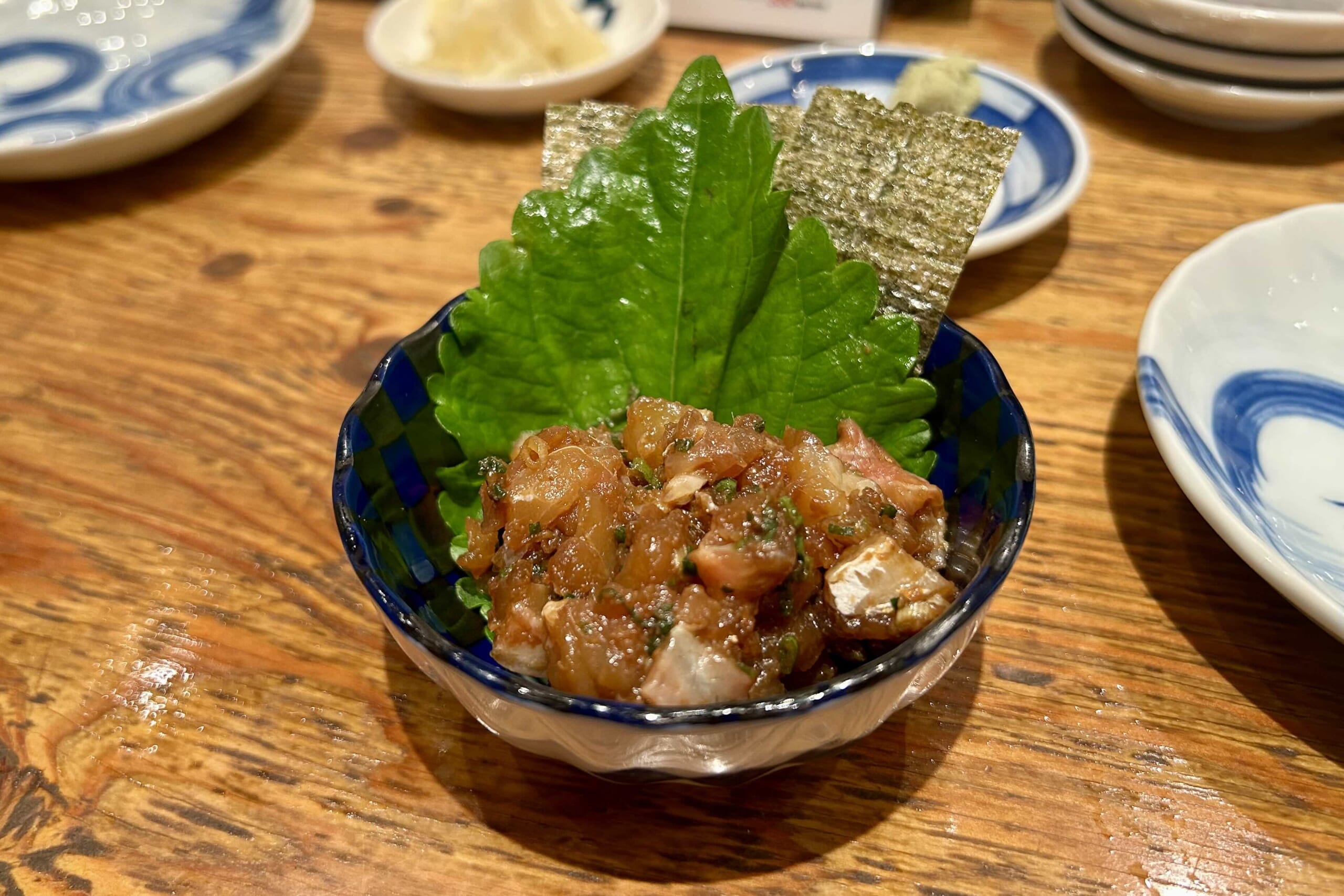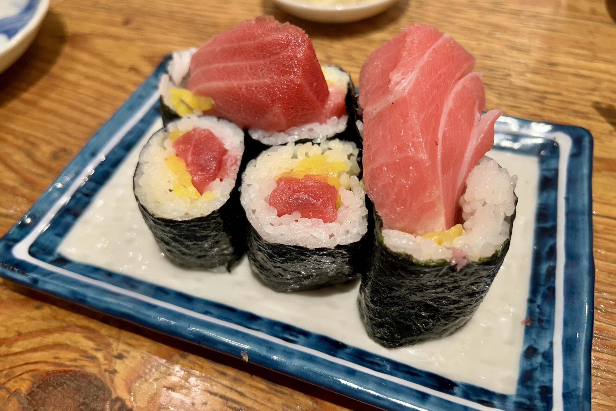しかし、向かいの店でそこそこ腹に収めてきた直後だ、控えめに頼むことにした。結局、なめろう(495円)うざく(528円)長芋の浅漬け(319円)クリームチーズ酒盗(429円)、そしてとろたく巻き(1078円)を選んだ。どれも美味かったし、酒がすすむ。我々は途中から菊正宗にかえて、さらにピッチをあげていった。ほかにもいろいろ工夫の効いたあてが用意されている。いやはや「すし酒場」というに相応しいなと思った。寿司屋の居酒屋使いなどと言わずともきっちり酔えるのだ。いや寿司だって、ネタのはみ出たとろたく巻きは、酒のあてにピッタリだ。